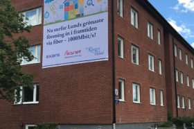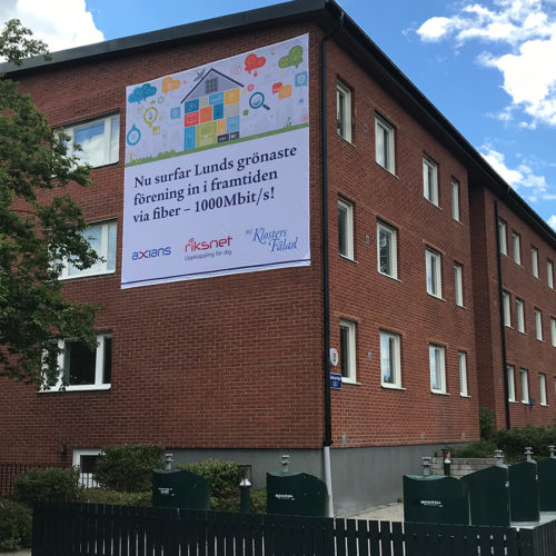 Brf Klosters Fälad V hjälpte Brf Klosters Fälad att synas med en stor vepa på fasaden. Budskapet var tydligt och klart – Lunds grönaste förening skaffar fiberanslutning till alla lägenheter.
